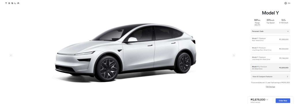 - Model Y Premium Long Range All-Wheel Drive: ₱2,749,000